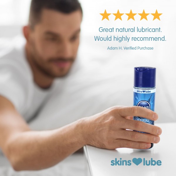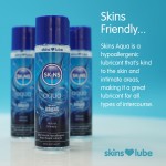 Το Skins Aqua προσφέρει μεταξένια απαλή αίσθηση και μακράς διαρκείας λίπανση για φυσική οικειότητα χωρίς διακοπές. Η τεχνολογία ReAquav8 επιτρέπει την αναζωογόνηση του λιπαντικού με λίγες σταγόνες νερού, διατηρώντας την υφή και την ομαλή αίσθηση καθ όλη τη διάρκεια της επαφής.