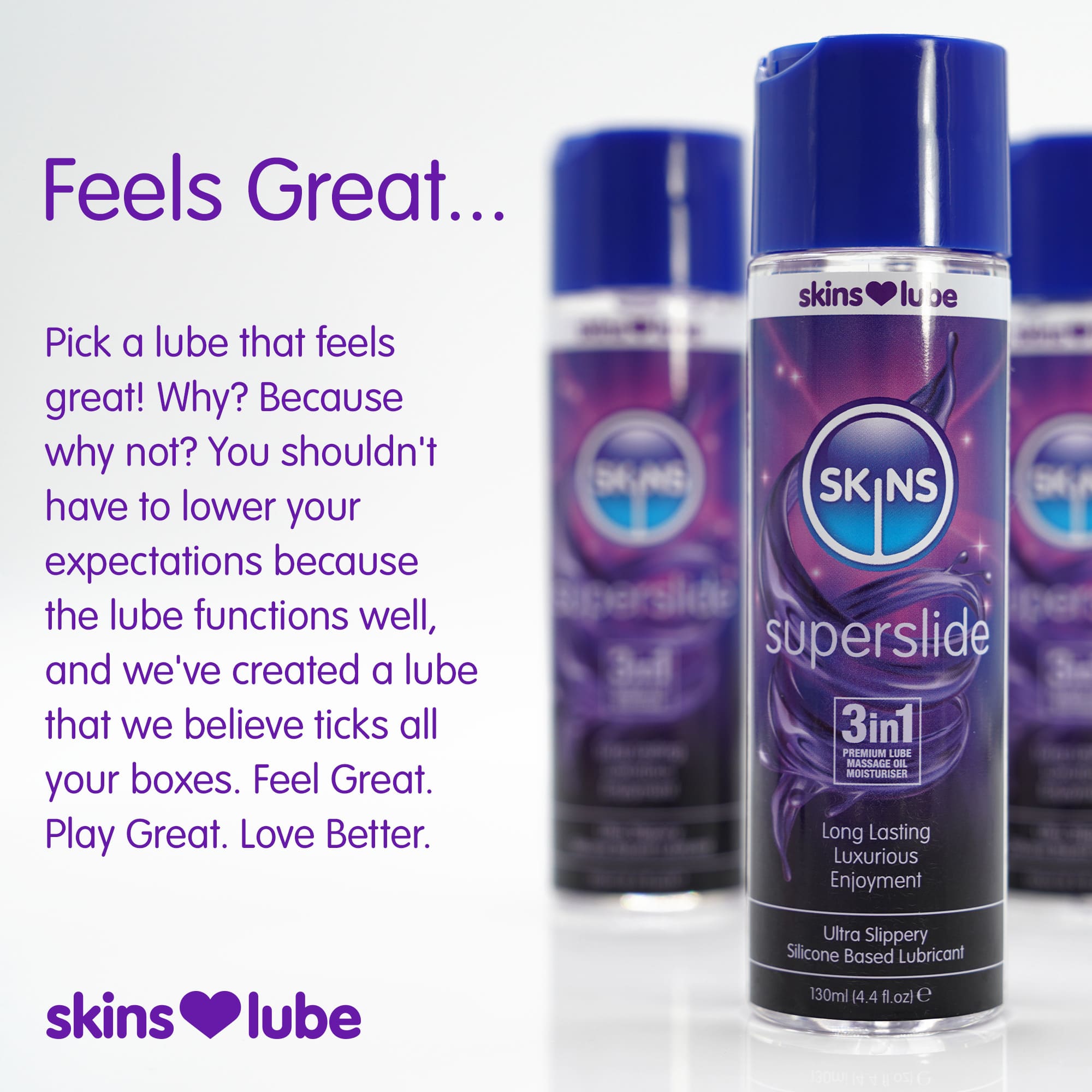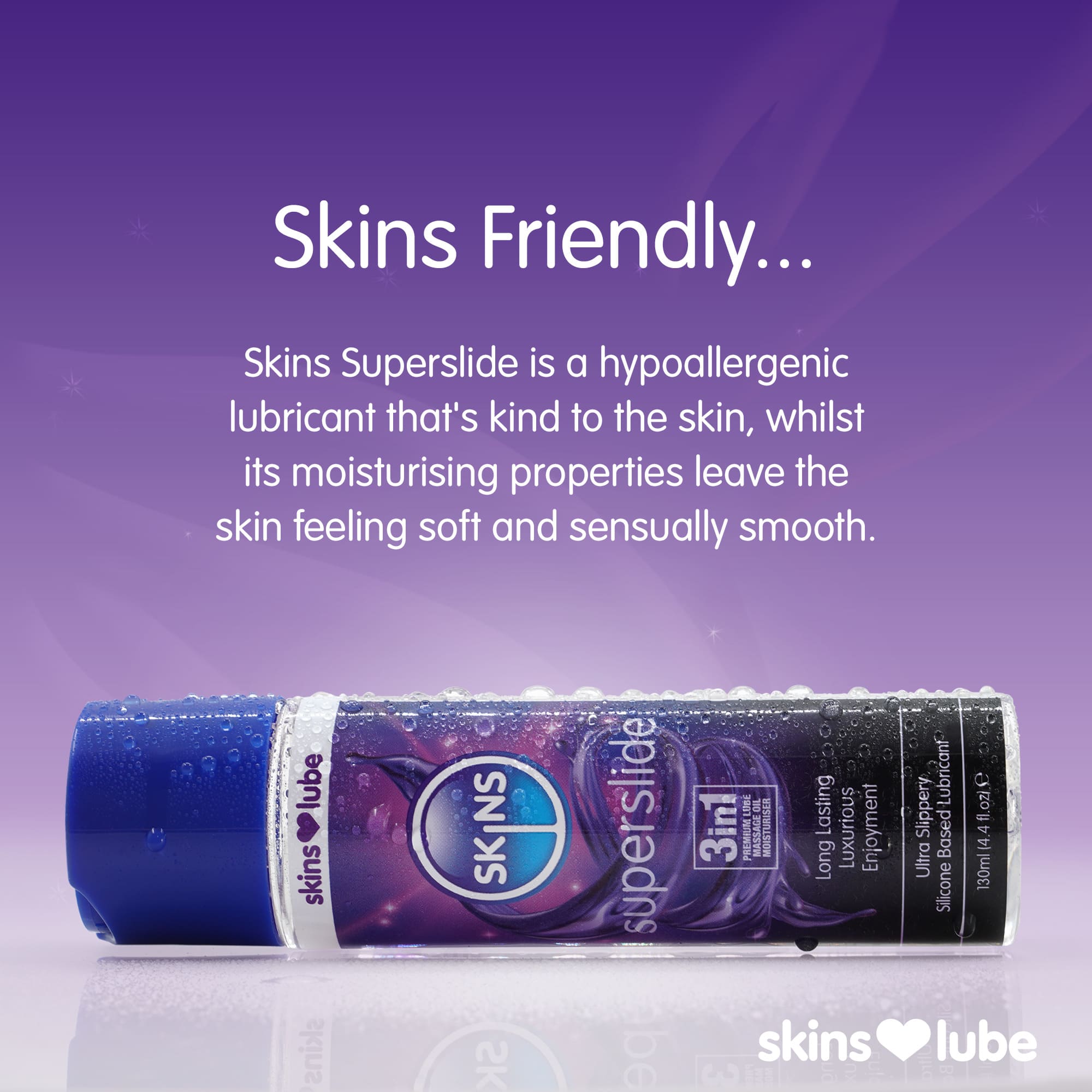 Χάρη στην υπερσυμπυκνωμένη φόρμουλα, απαιτείται μόνο μικρή ποσότητα για άμεσο και σταθερό αποτέλεσμα. Το Skins Superslide είναι ασφαλές για χρήση με λάτεξ και κατάλληλο για εσωτερική χρήση, καθώς τα μόρια σιλικόνης δεν απορροφώνται από το σώμα.